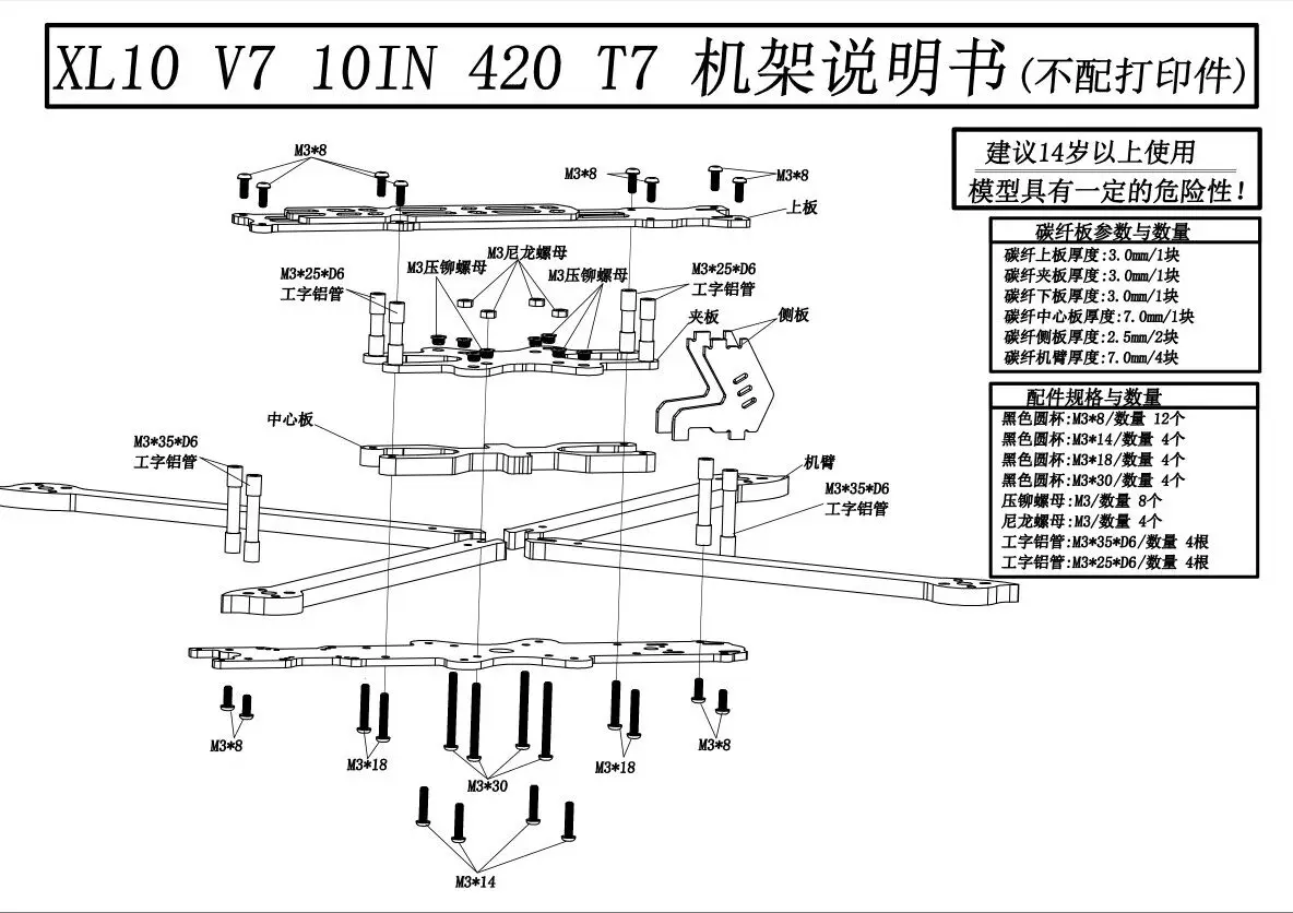 XL10 V7 10inch T7 420mm Wheelbase with 7.0mm Arm TrueX Carbon Fiber Frame for Super Long Range FPV Freestyle Frame Quadcopter